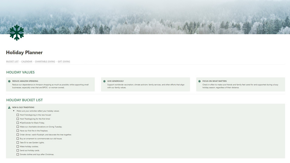 Second, I think it's important to keep personal values front and center during busy seasons. If you've been thinking about ways you might give back to your community this holiday season, but it always seems to get lost among all the capitalism, this template is meant to help you set out your holiday tasks and events in ways that align with your values.